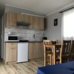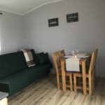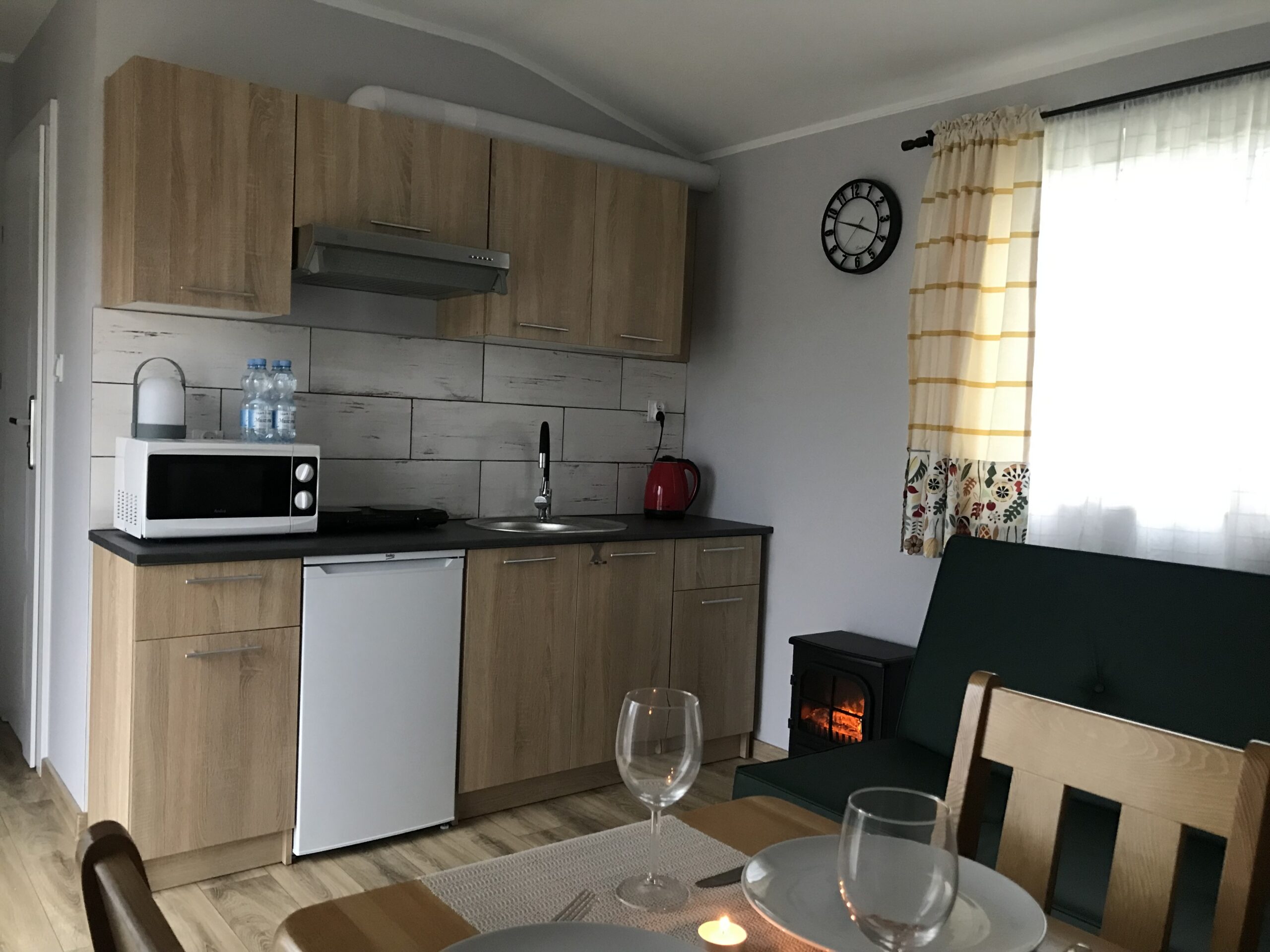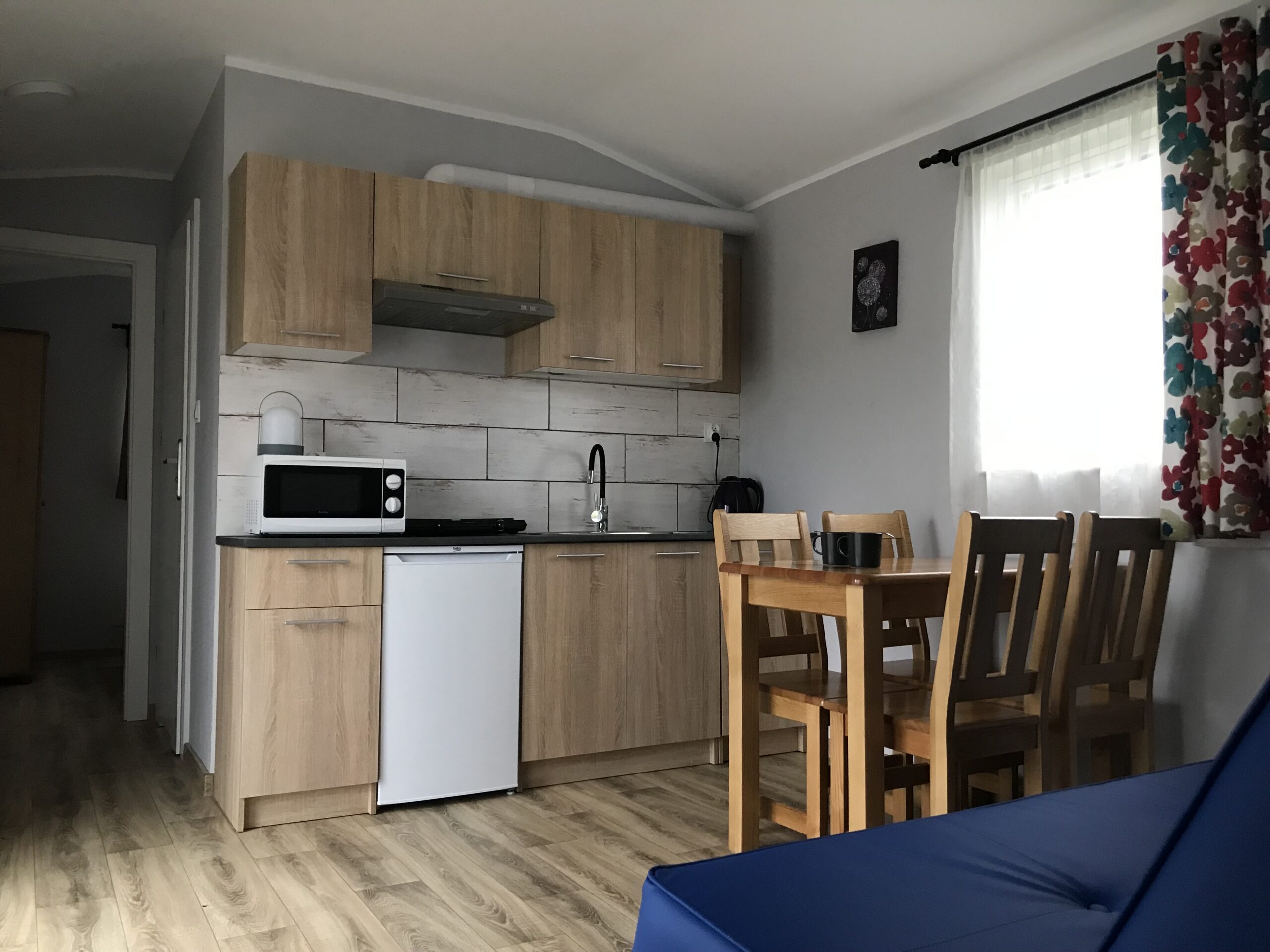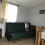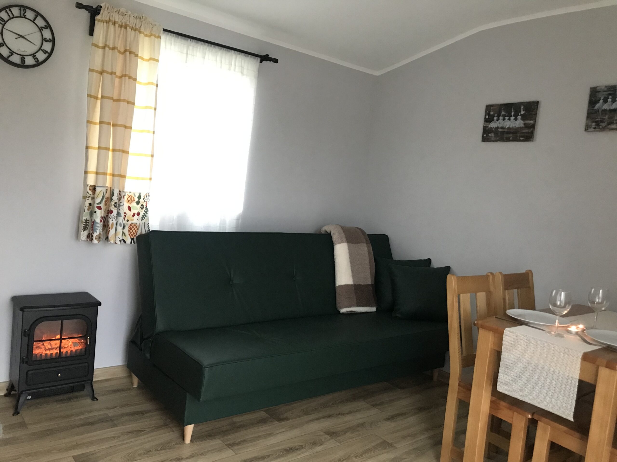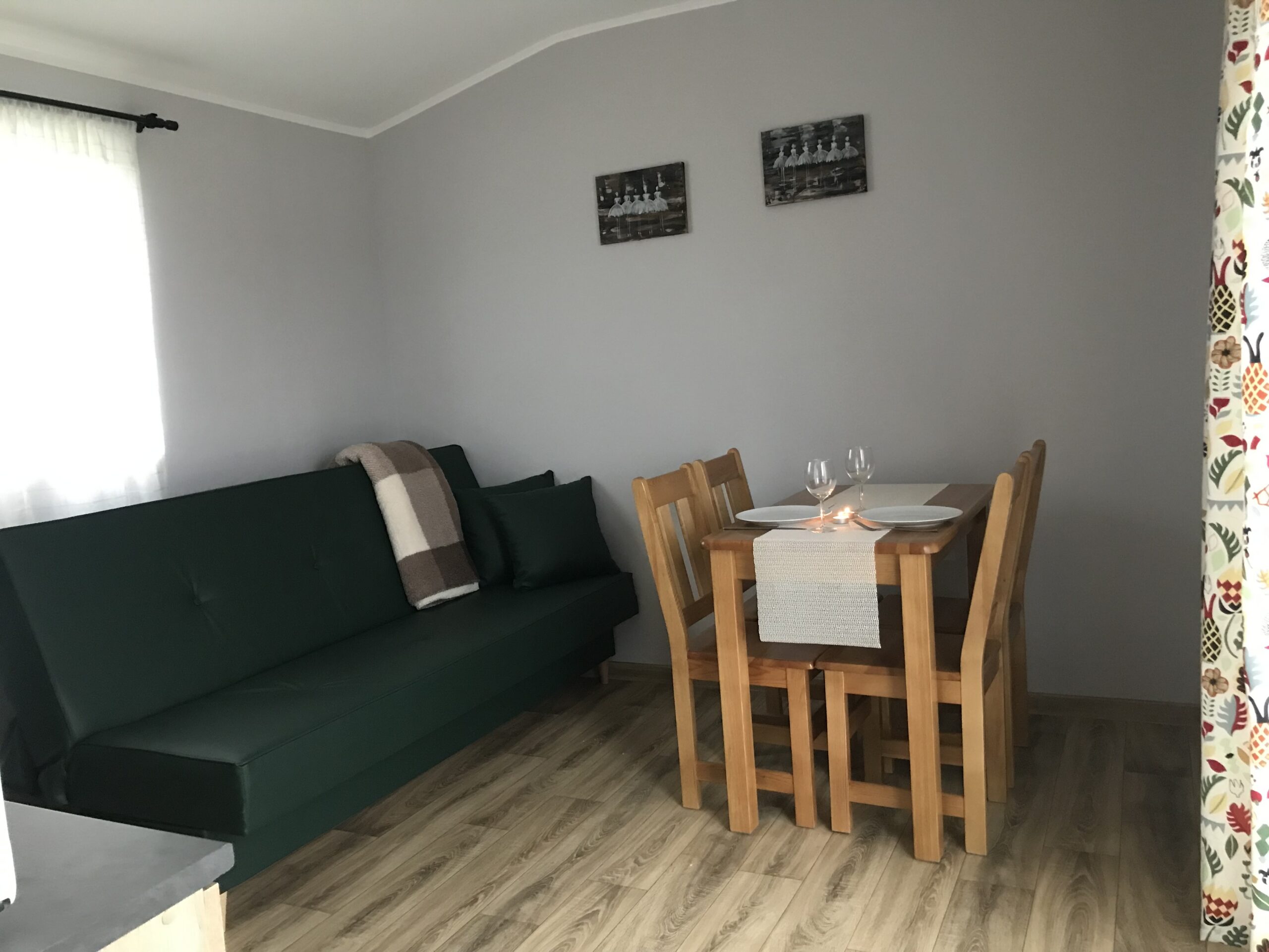- salon z wyposażonym aneksem kuchennym i rozkładaną sofą,