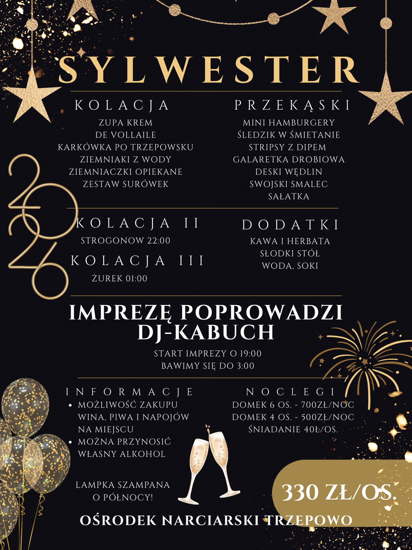 330 zł/osoba, alkohol we własnym zakresie.